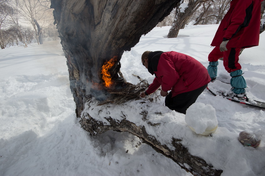 На обед выползли на какой-то местный водораздельный гребень. Обед ~13-00 – 14-00 в разлучине дерева (в итоге оно, дуплистое, загорелось, через дупла начал валить дым, а вниз капать вода из талого снега).