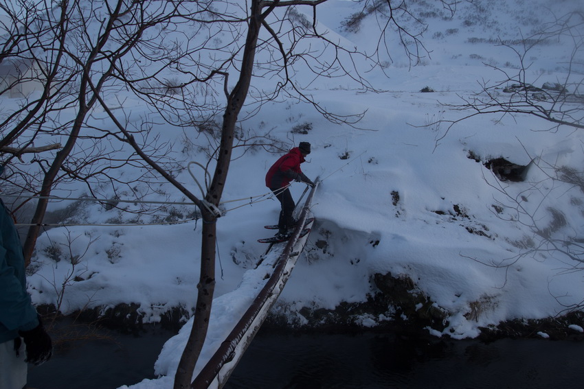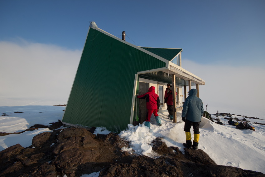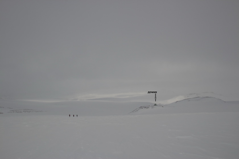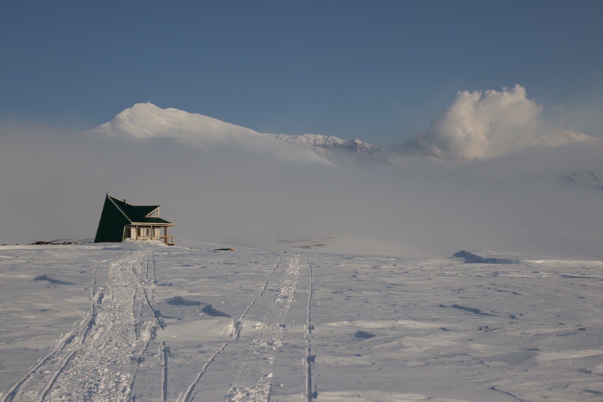 Под перевалом неожиданно оказался симпатичный домик с сараем и туалетом на каких-то термальных полях (снег протаявший и кап'ель сосулек, хотя на улице отнюдь не оттепель). Сарай и туалет открыты, но доверху забиты снегом. Домик закрыт, хотя одно из окон разбитое, чиненое и заколочено досками. Раскопали в снегу площадки под палатки, отгородившись от нарастающего ветра домиком.