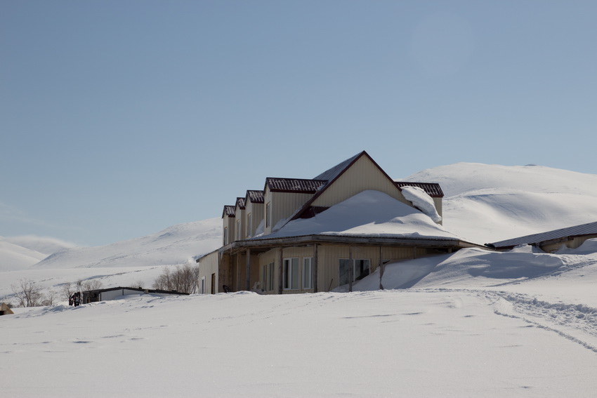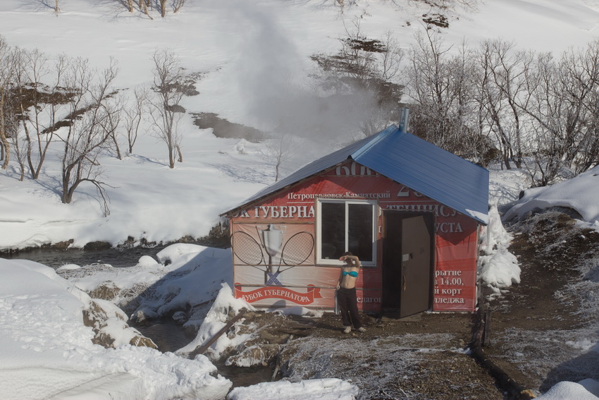 Вокруг общежития какой-то угрюмый северстроевский пейзаж: огромные бульдозеры, гусеничный приземистый вездеход, бараки, сугробы, от некоторых конструкций идет пар. Местные рекомендовали искупаться в источнике, который здесь представляет собой бетонный бассейн с горячей водой под открытым небом.