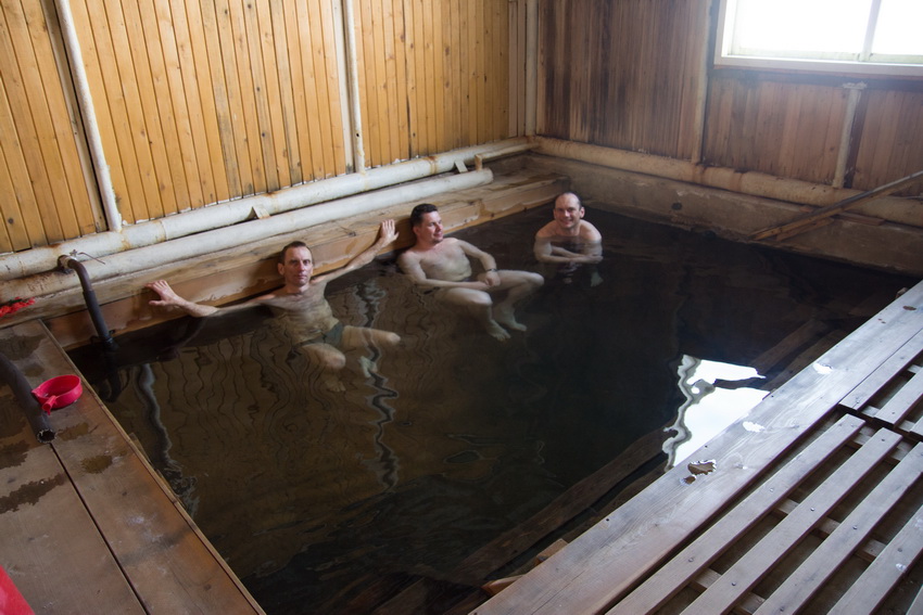 Хотели поселиться максимально бюджетно, нам предложили вагончик без света за 3000 руб. со всех, в итоге заняли апартаменты на самой базе (типа конференц-зала) за 1000 руб/день/чел. Это большая комната с 2-я столами, 4-я (?) диванами, туалетом, душем.., только батареи отопления не работают, и, хотя жить тепло, сушится негде. Я устроил газовую атаку из вкладышей в сапоги в раздевалке при бассейне. Конечно же, имеется бассейн (2) с термальной водой под открытым небом.