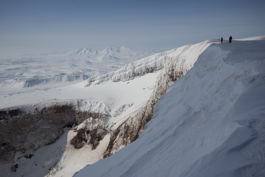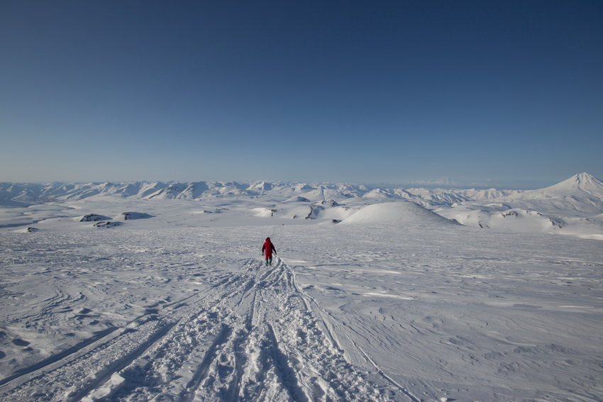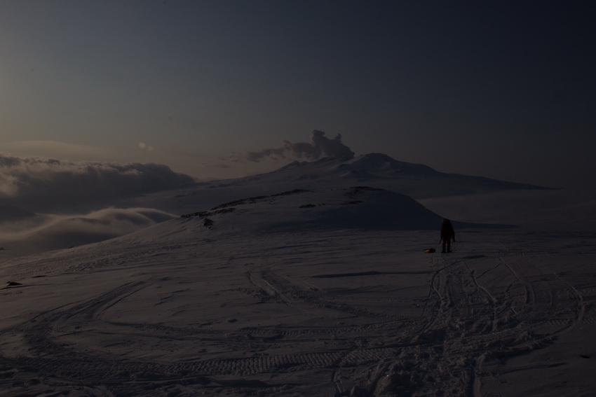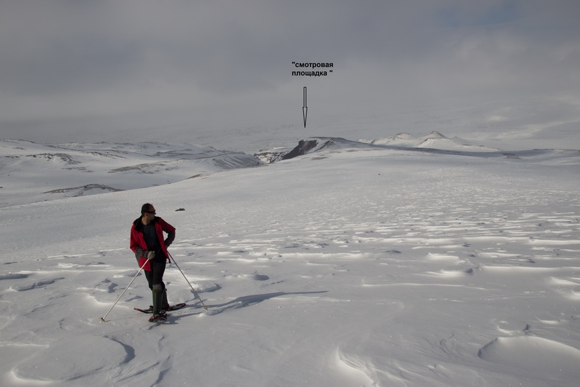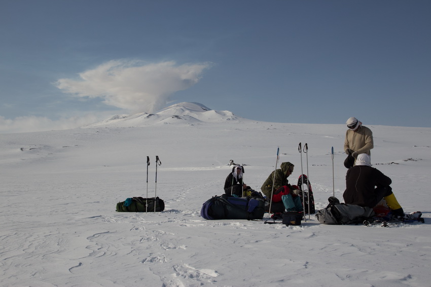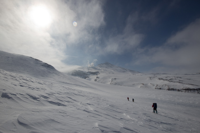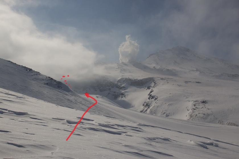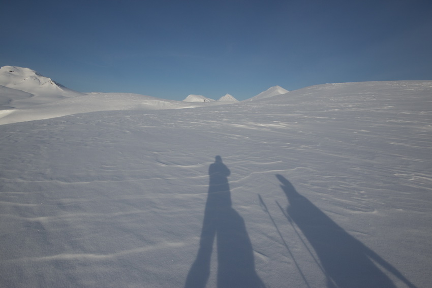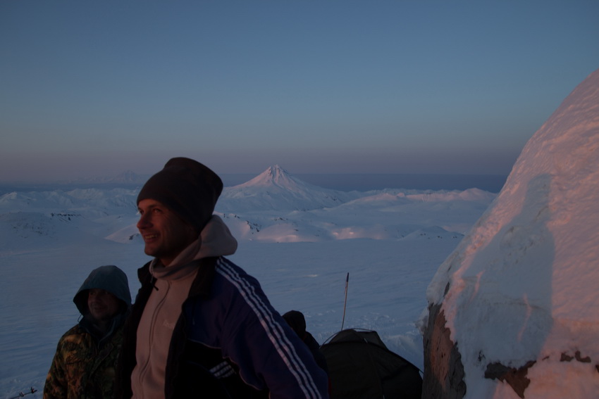 В ~14-00 встретили двух снегоходчиков (министр спорта и туризма Иванов А. Б. и каратист Руслан (или Ярослав?)). Министр симпатичный – хорошо знает географию края, предложил забросить рюкзак поближе к вулкану. В итоге забросили 3 рюкзака и все санки под вершину (что имело последствия), а Сашу – к подножью, где он должен был заняться обедом. Когда Саша уехал, я как-то начал тревожится – на снегоходе скорости совершенно другие и можно вполне упилить далеко вперед, а организм хочет обеда… В марафонском темпе перевалили через край кальдеры. Очередной оптический обман – кажется, вулкан совсем рядом, но дошли до Саши мы только ~16-00. Видели как "наши" снегоходчики поднимаются вверх по склону – ощущение как будто по вертикальной стенке. Пока пили чай (+колбаса+сухари+орехи) вернулся министр. Угостили его чаем с салом, а он нас – котлетами и хлебом.