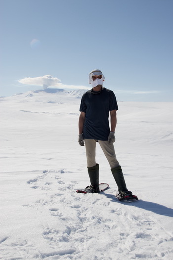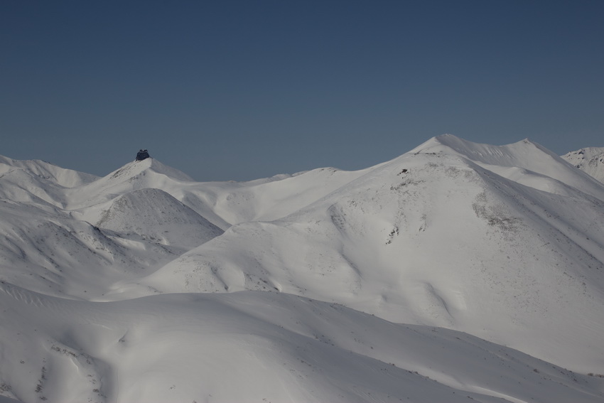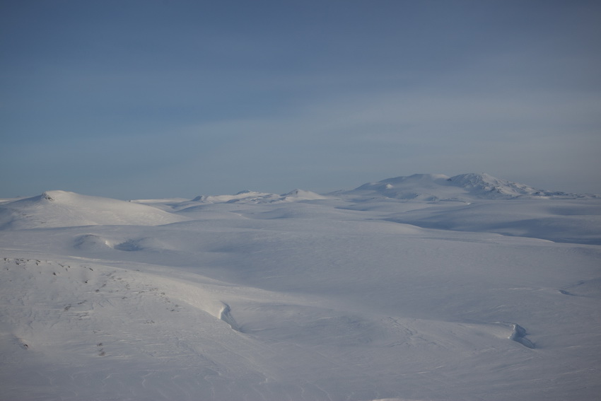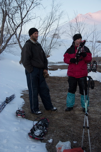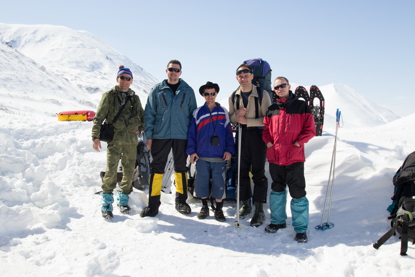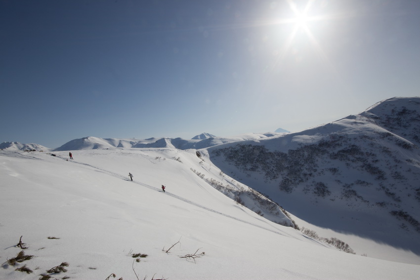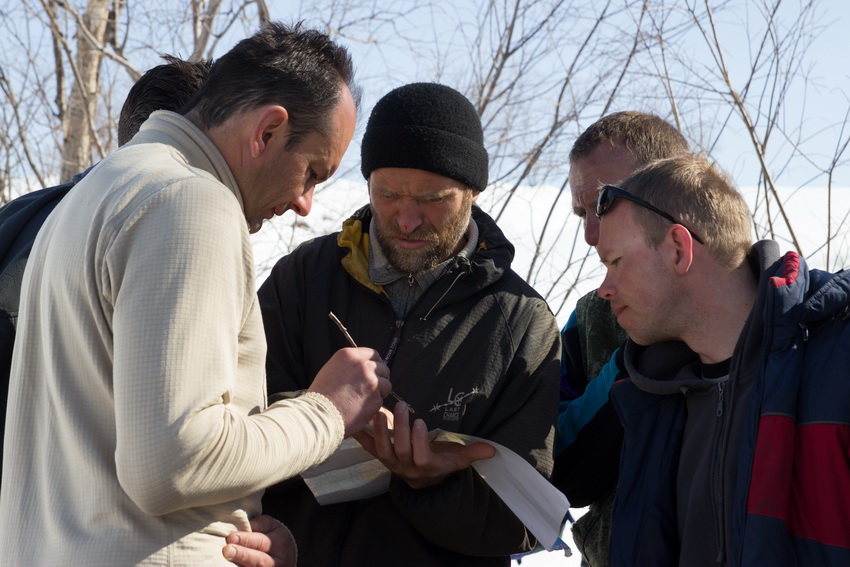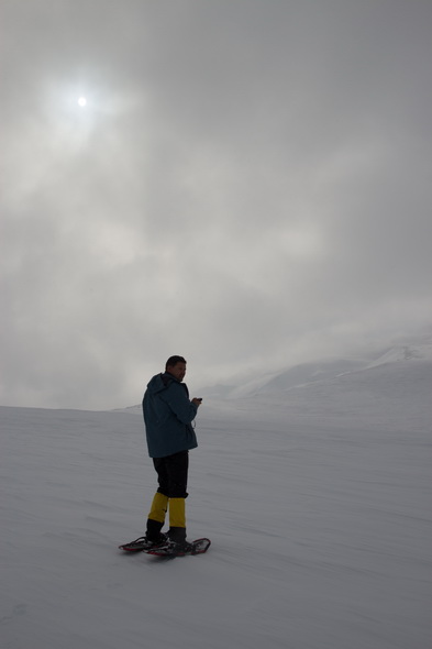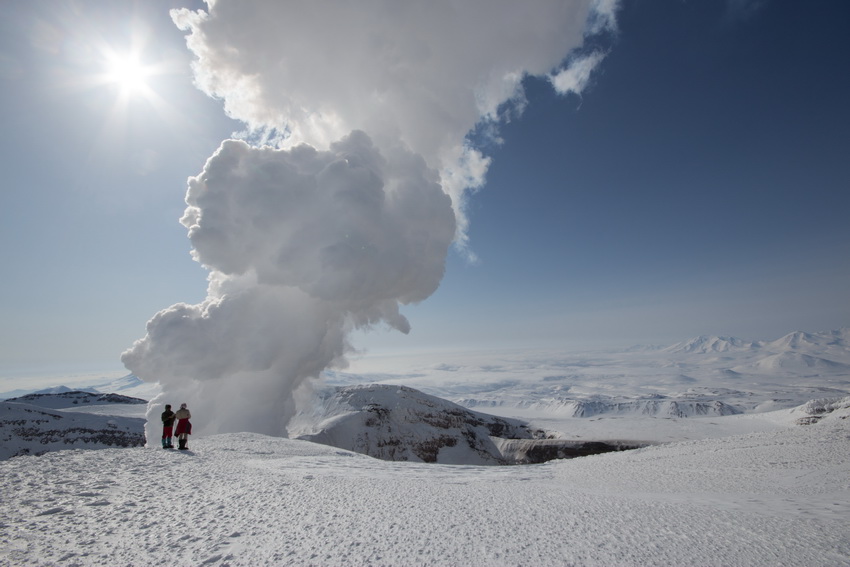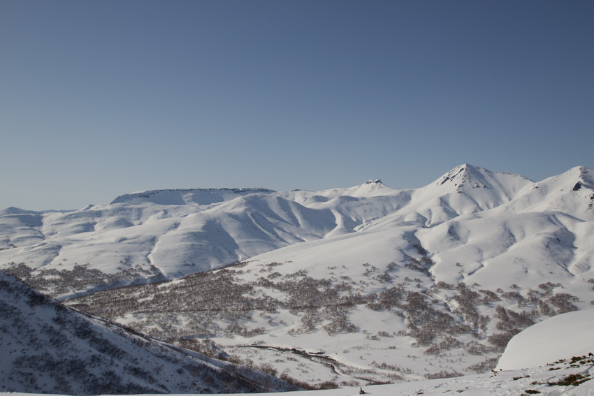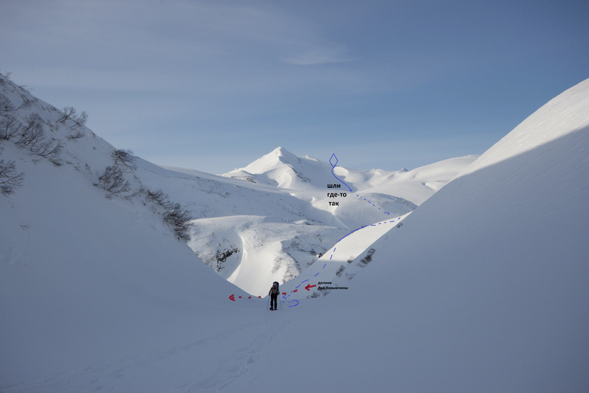 В ~14-00 встретили двух снегоходчиков (министр спорта и туризма Иванов А. Б. и каратист Руслан (или Ярослав?)). Министр симпатичный – хорошо знает географию края, предложил забросить рюкзак поближе к вулкану. В итоге забросили 3 рюкзака и все санки под вершину (что имело последствия), а Сашу – к подножью, где он должен был заняться обедом. Когда Саша уехал, я как-то начал тревожится – на снегоходе скорости совершенно другие и можно вполне упилить далеко вперед, а организм хочет обеда… В марафонском темпе перевалили через край кальдеры. Очередной оптический обман – кажется, вулкан совсем рядом, но дошли до Саши мы только ~16-00. Видели как "наши" снегоходчики поднимаются вверх по склону – ощущение как будто по вертикальной стенке. Пока пили чай (+колбаса+сухари+орехи) вернулся министр. Угостили его чаем с салом, а он нас – котлетами и хлебом.