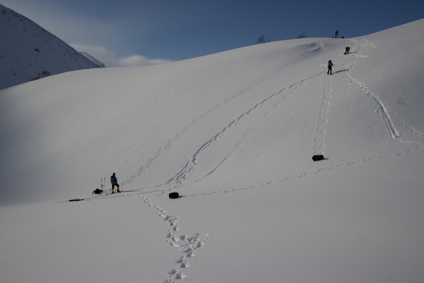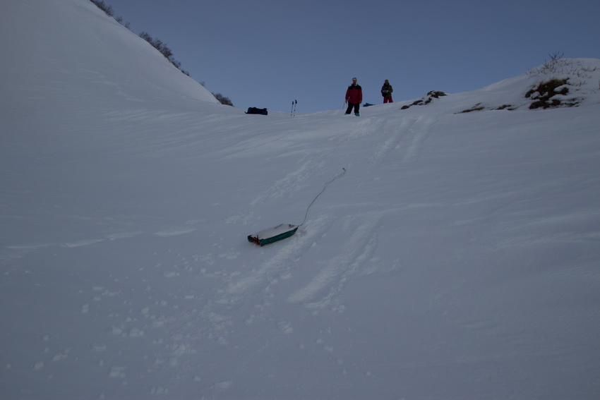 Вышли поздно ~11-00. Моя очередь с утра тропить. Перевал взяли бодренько, но разными путями. Я залез на правый (орографически) отрог и шел по плотному снегу и фирну, кое-где хотелось одеть кошки. Остальной люд пошел "в лоб" – по ручью. У них подъем был покруче и по глубокому снегу, но мне пришлось траверсировать 2 очень стрёмных (в смысле лавин) кулуара и делать челночную операцию за саночками. Это оказалось единственное за поход использование лавинного шнура. Вообще, со слов местных, у них лавины сходят или во время снегопада, или сразу после. "Наш" перевал выглядел очень "лавинным", но в "нелавинную" погоду.