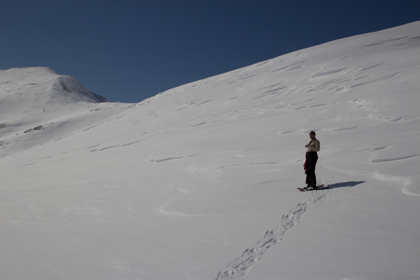 Время - ~13-45. Спускаемся медленно, сильно подлипает снег. В долине много парных заячьих следов. Брачуются. Не помню историю прикола, но на каждом перевале мы ожидаем блондинок для Шурочки (к концу похода об этой предыстории как-то все подзабыли и стали ждать маленьких рыжих девочек). На этом спуске поломался снегоступ у Егорова ("родные" шайбочки слишком маленькие).