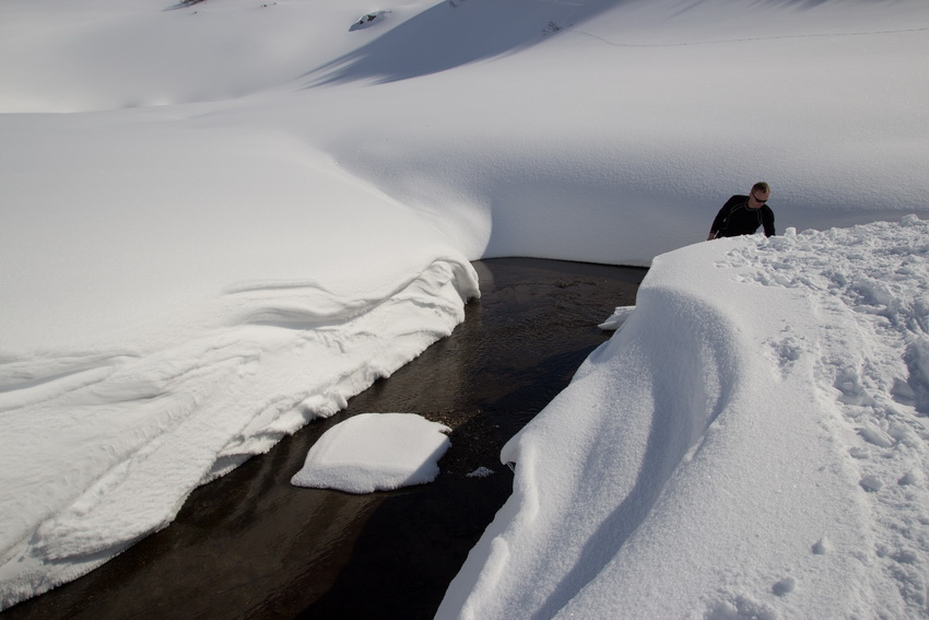 В итоге, Источники оказались ниже "перевального" притока ~ 500-1000м. Стали. Дров много. Исследуем "ванны" на предмет температуры и помещаемости туда человеческого тела. "Ванны" представляют собой откопанные под правым берегом в гальке лежбища, которые заполняются водой, просачивающейся из реки и стекающим по береговым камням кипятком. Регулировать температуру можно подсыпая лопатой снег. Но сегодня никто так и не окунулся…