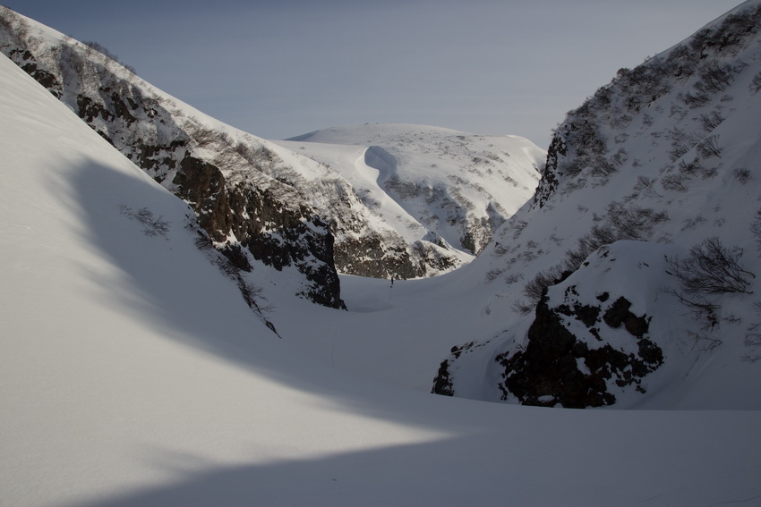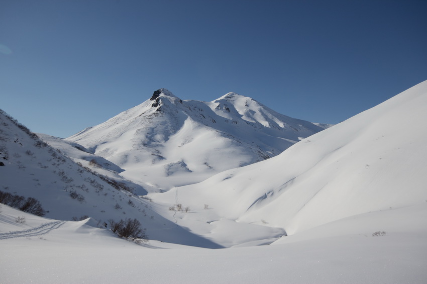 Вышли ~13-30. Наш путь – косой нисходящий траверс восточного склона. Погода по-прежнему солнечная, но поддувает ветерок с В и на З между хребтов стелются какие-то слоистые облачка (St). Спустились в долину р. Освистанной и перекусили под камнем, напоминающим какой-то менгир. Съеден подаренный гематоген. Рядом видны следы медведя (?) – вторые за поход. Когда уходили, забыл на камушке олазоль (пытался разморозить на солнце). Только отошли, как у Егорова порвалась опорная лента снегоступа. Пока чинились, набежала тучка, задул ветерок и стало очень холодно. Чинились до 17-45 (Селезнев с Верочкой отремонтировали за это время рюкзак) и поспешили к перевалу между соп. Двугорбой и влк. Мутновским.