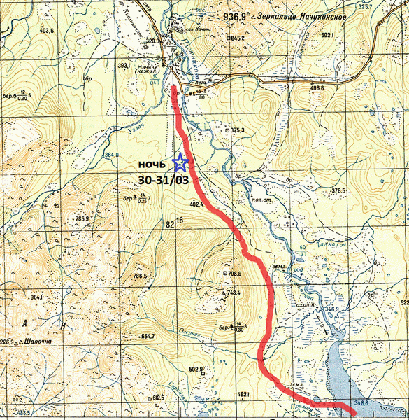 Саша внизу колет дрова. При растопке печки бензином его чуть не побрило огнем (пока он единственный стойко не бреется). На завтрак – гречневая каша с колбасой (!) – ох, не к добру это, руководство зря кормить не будет… На улице просвечивает солнце. Егоров чинит хозяйскую лопату. Я чиню (ну, конечно же) штаны – молния на клёше разошлась еще на Карымчине. Время ~8-55.