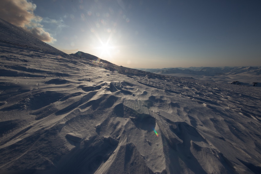 Выглянуло солнце – красота! Угадывается направление перевала (направо за углом). Прошли немного по "нашему" гребню и увидели заброшенный балок (или, скорее, барак), засыпанный снегом. Правда по дороге к нему пришлось спустится по очень резкому склону. Залез через разбитое окно – кроме мусора ничего существенного нет.