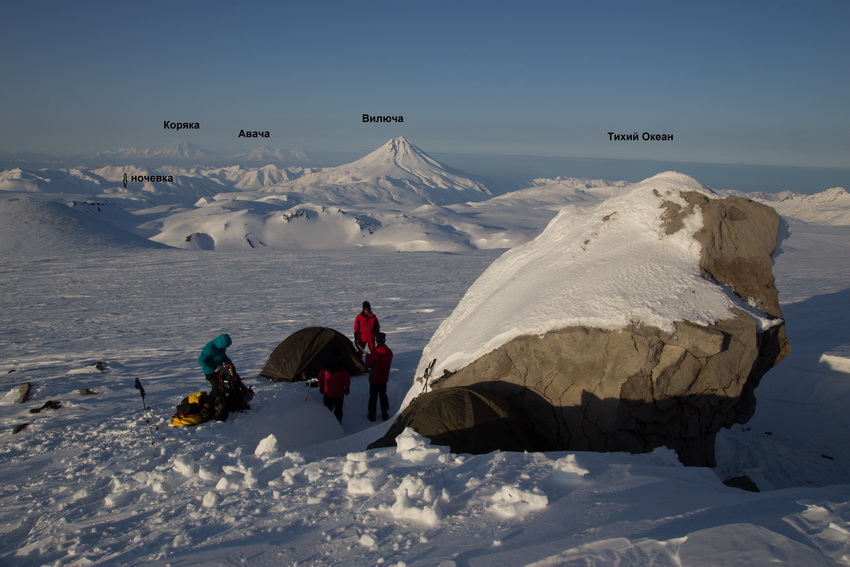 Пили спирт за медиум. На ужин – пюре с мясом. Чай я сварил почему-то с резким запахом бензина, и пить его было сложно. Сам я употребил его много и ночью имел бензиновую отрыжку. Еще было печенье (1/2 пачки). Дует легкий стоковый ветер, сильный мороз. Дым с вулкана днем был на ЮЗ, сейчас – на З. Вид обалденный: пока было светло красовались Корякская, Авачинская, Вилючинская сопки, Тихий океан, а когда стемнело стали видны огни Елизово и ПП. Пишу в 22-20, в палатке хорошо, болтаем. Олазоль замерз, но с крышечки можно намазать обгоревшее лицо. Снова укутываю ноги курткой.