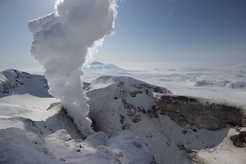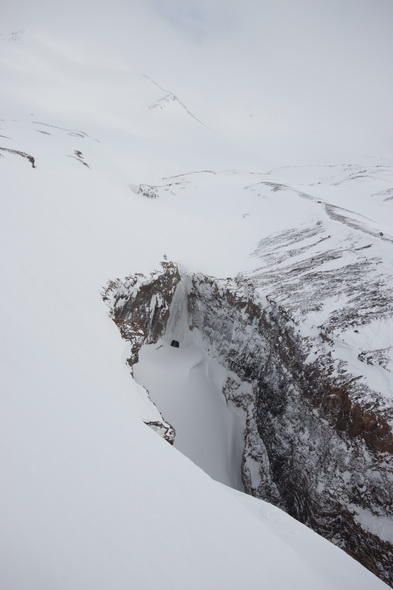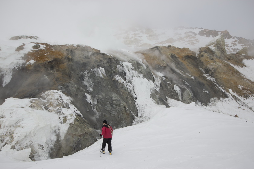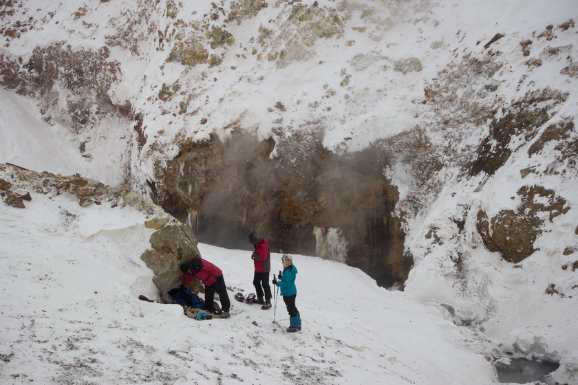 , около которого оставили вещи и переобулись в кошки. Но дошли только до фумарольных полей – дальше непроход из-за огромных масс снега. Саша, который бывал здесь летом, с трудом узнал местность, тем более, что видимость у нас ограничена из-за погоды. В нашем случае мы находились на краю огромной протаявшей в снегу чаши глубиной метров 10 и шириной 30, заполненной сернистым паром. На ее дне и стенках – разноцветные скальные обнажения. До "активной воронки" дороги нет.