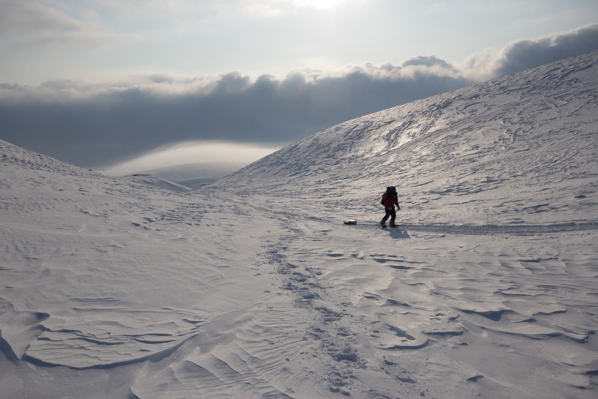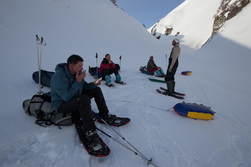 Долбаный траверс! Траверсы я недолюбливаю – из-за этого кажущегося облегчения пути я попадал в неприятности. В наших условиях такой способ движения по склону нехорош вообще – во-первых перекашиваются снегоступы, а во-вторых саночки тянут вбок и вниз. Итог – обычный. То, что издали казалось проходимым по левому борту долины, оказалось прорезанным глубоким ущельем от г. Сундук (или Ящик). Хорошо еще, уклон позволял в это ущелье кое-как спуститься. Играли "взапуски" саночками – чьи дальше уедут. Некоторые катали рюкзаки (катились они, конечно, куда-то вбок).