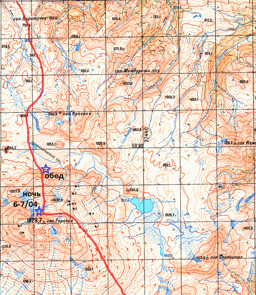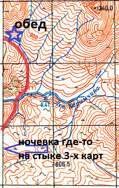 Сегодня окончательно определились с дальнейшим маршрутом: первоначальная идея идти через Толмачев Дол была заменена на путь через верховья Средней и Левой Карымчины с выходом к влк. Горелый с севера. На обед суп (от Игоря) + последний рыбный консерв.
