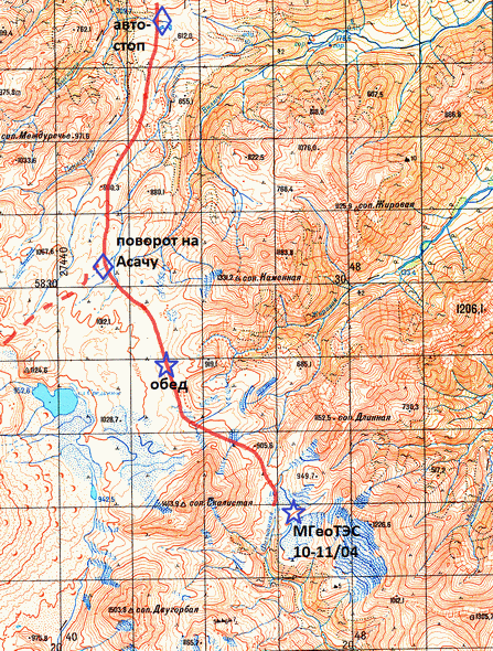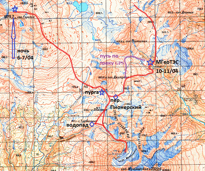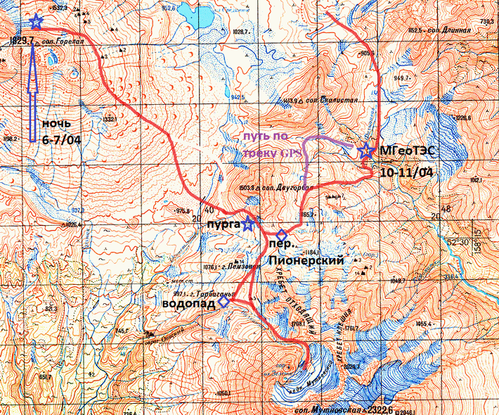 Дальше по GPS трек "обскакивал" по верхам правые истоки р. Фальшивой, траверсируя северные склоны сопок Двугорбой и Скалистой и сваливался к МГеоТЭС (на карте обозначен фиолетовым). Нам в условиях отсутствия видимости пересекать овраги с крутыми стенками не удалось. Получалось как у Толкиена: