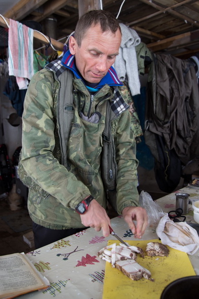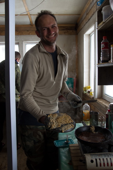 Спал опять с онемениями. Не холодно. Учитывая информацию, что местные работяги придут к 7-00 забирать вещи (никто не пришел), встали рано (Егоров аж в 6-30). Шуру откомандировали к метеорологу и насчет транспорта, а мы с Егоровым чиним его снегоступ. На завтрак готовил кофе с остатками сахара и 5-зерновую кашу (опять пересолил). Все местные незаметно разошлись, и не кому было сказать спасибо за приют.