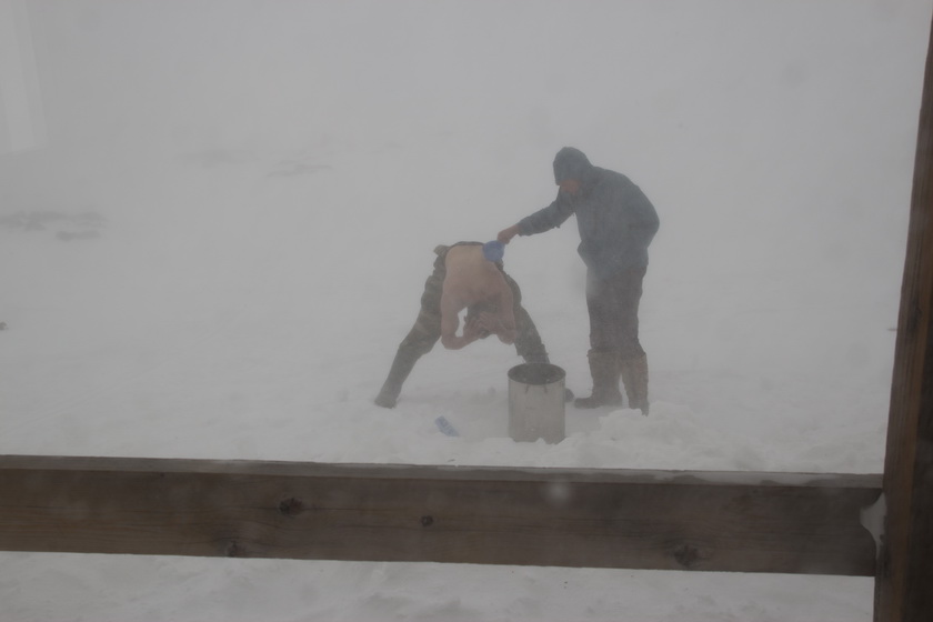 Ночью нашу палатку потряхивало от ветра, но спалось неплохо. Селезнев даже сказал, что это была самая теплая и спокойная ночь. Окончательно проснулся от шевеления Шуры где-то на улице ~8-00. Подумал, что он кочегарит завтрак. С идеей сходить в туалет начал неспешно собираться. Количество инея на палатке – как обычно, но внутренний тент снаружи основательно присыпан снегом. Все вещи между внутренним и наружным тентами под толстым слоем снега. Выхожу из палатки и наблюдаю печальную картину: на улице со страшной скоростью несутся потоки снега, а, "звено Шуры" (Шурочка и Верочка, хабитанты конкурирующей палатки), оказывается, пока мы дрыхли, боролось всю ночь за существование и пыталось не улететь. Ветер еще около полуночи перешел на "пару румбов к весту" и их палатка оказалась не защищена домиком. Пытаемся переместить Шурину палатку в менее продуваемое место, но теперь это уже невозможно (да и бесполезно). В это время надо мной пролетает взлетевшая приставная лестница (килограммов 10), и, если до этого я был против актов вандализма, то теперь во мне зреет мрачная решимость…