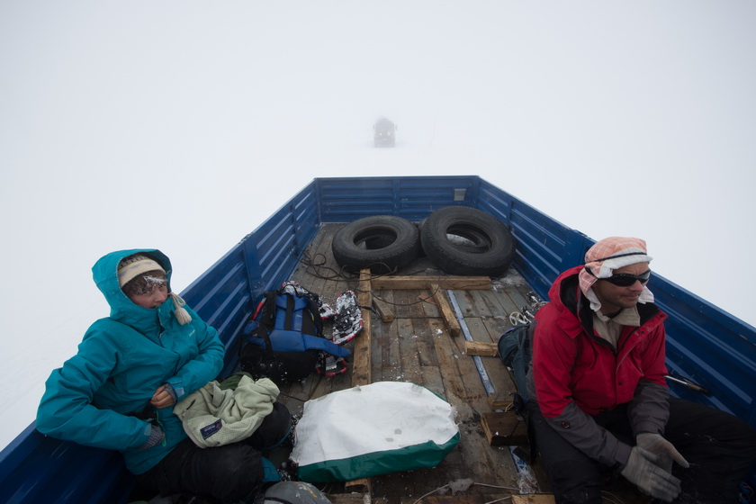 Как это часто бывает, когда уже появлялось ощущение пиз-ца, все резко улучшилось. Навстречу двигались снегоходы с туристами с базы отдыха "Снежная долина". Выяснилось, что на перевале есть бытовки дорожной службы и какая-то связь, а эти снегоходчики могут нас подобрать с "нартами" (сани, цепляющиеся к снегоходу).
