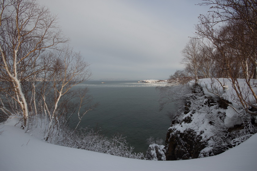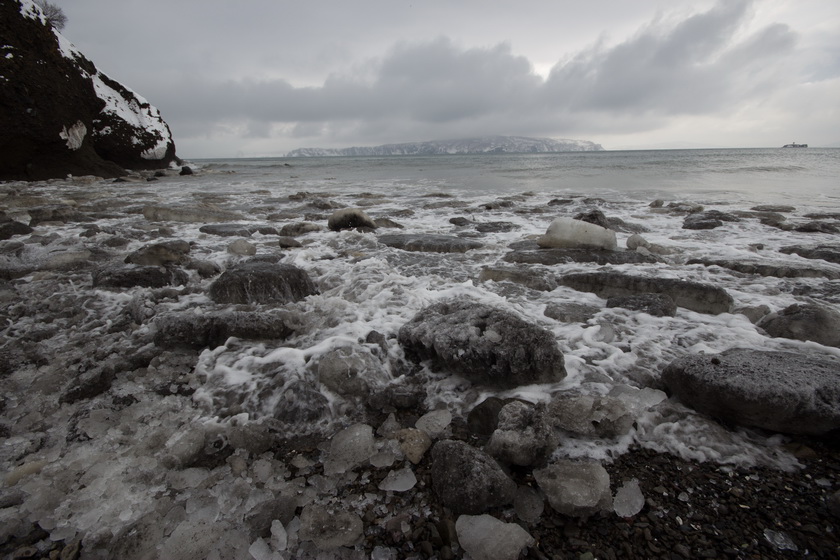 Идем еще 2.5 км вдоль, условно говоря, океана. На дороге огромные лужи, попытался идти по "обочине" на снегоступах и провалился по пояс. Дошли до открытой воды. Зрелище – так себе: около берега в грязной взбаламученной воде толкутся большие (опять же грязные) глыбы льда. Но все равно впечатляет. Только купаться расхотелось. В бухту заруливает большой корабль.