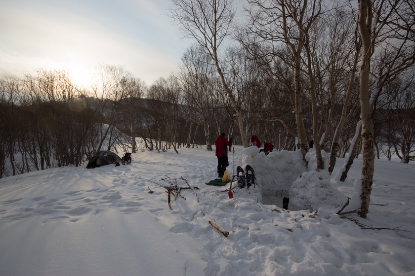 Погода на глазах портится – со стороны океана движутся какие-то осадки. Все равно решили ночевать на продуваемой обрывистой сопочке над обрывом. Катаем из снега "снежную крепость"