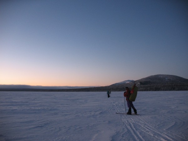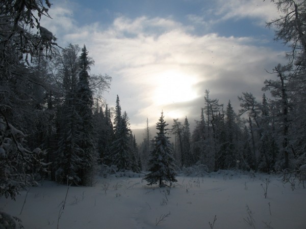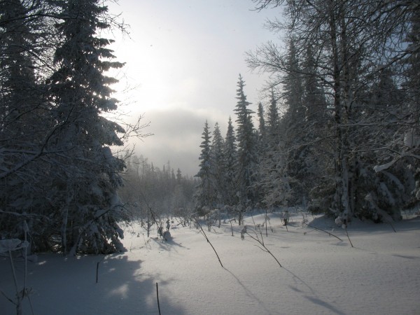 Остаток светового дня мы провели на лыжах, и не выходя из леса дотащились примерно до подножья хребта Нургуш.
