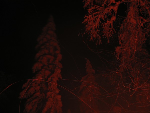 Когда стемнело развели огонь. Ну, сами знаете, огонь — это всегда здорово и получше любого телевизора с новогодними программами. Дров не жалели. Нагрузили бревен с горкой. Согрелись, поели жаренного сала и сами чуть ни поджарились.![]()