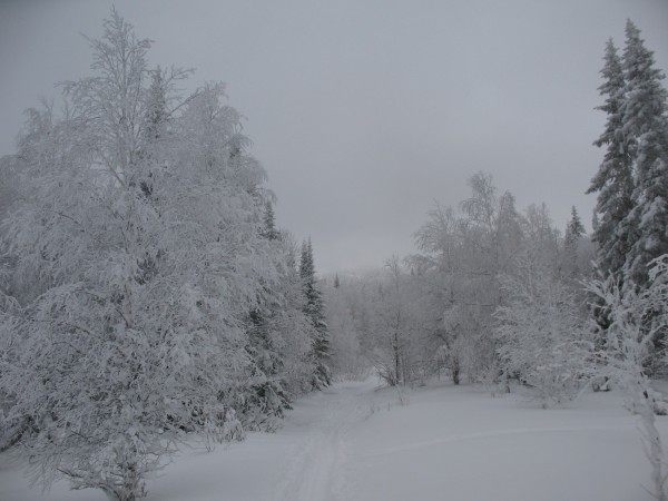 Мы дошли до перевала между Нургушем Большим и Нургушем Малым. Это место представляло собой заснеженный коридор среди леса, обросшего белой пушистой коркой. При общей туманности и хмурости атмосферы заподозрить его в соседстве с горами было трудно. Подъем, хоть и был весьма пологий, но все же был ощутим. И там, где он прервался, незаметно сменившись плавным спуском, GPS указал на наличие перевала.