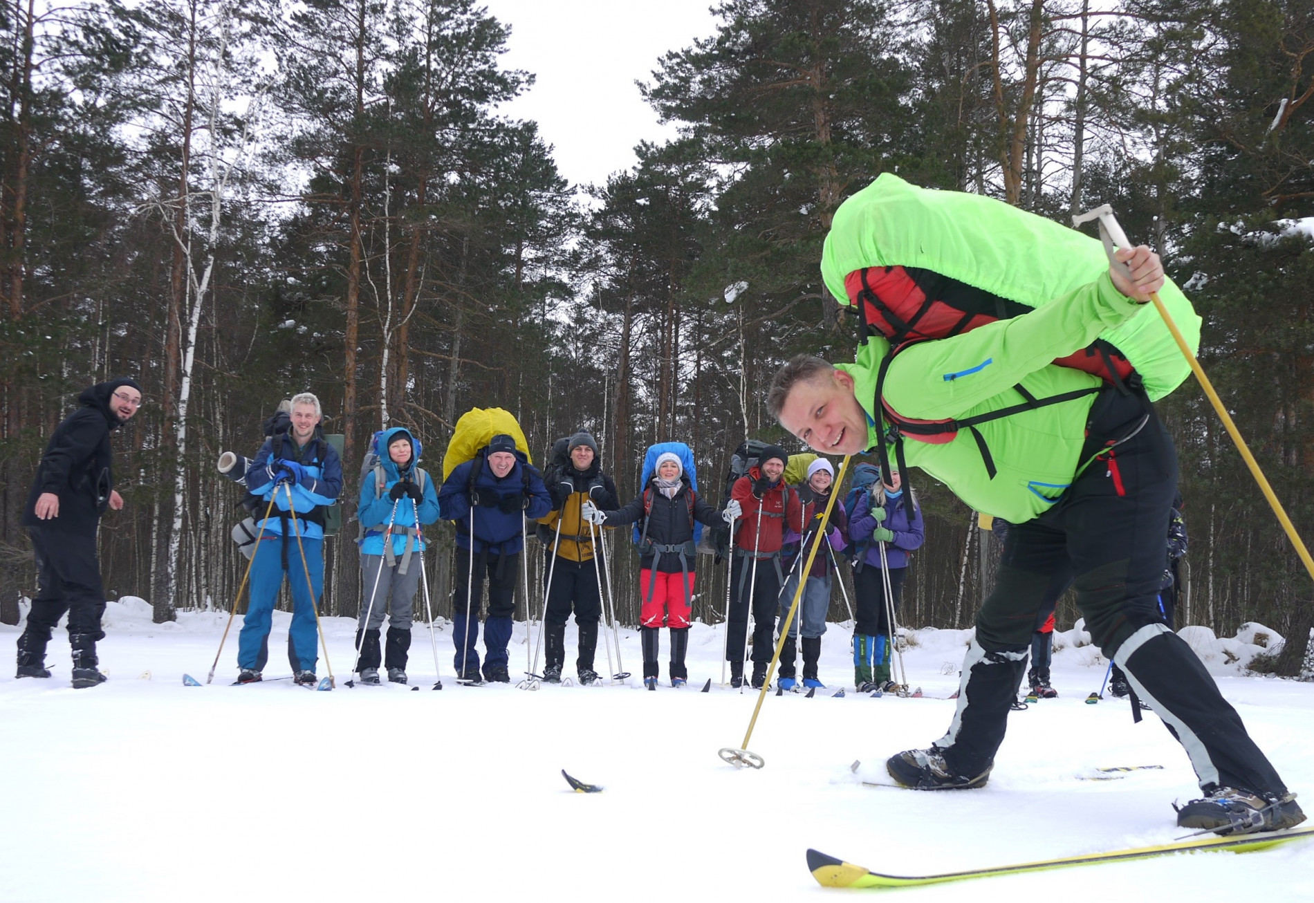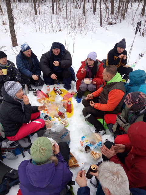 Когда все надели лыжи, стало понятно, что для Прохора этот поход будет задачей со звездочкой. Или его лыжные крепления уселись при стирке, или ботинки растянулись при носке, но они между собой состыковывались буквально на 1 см. Выглядело это не особо надежно, что не могло не вызывать многочисленные шуточки по этому поводу.