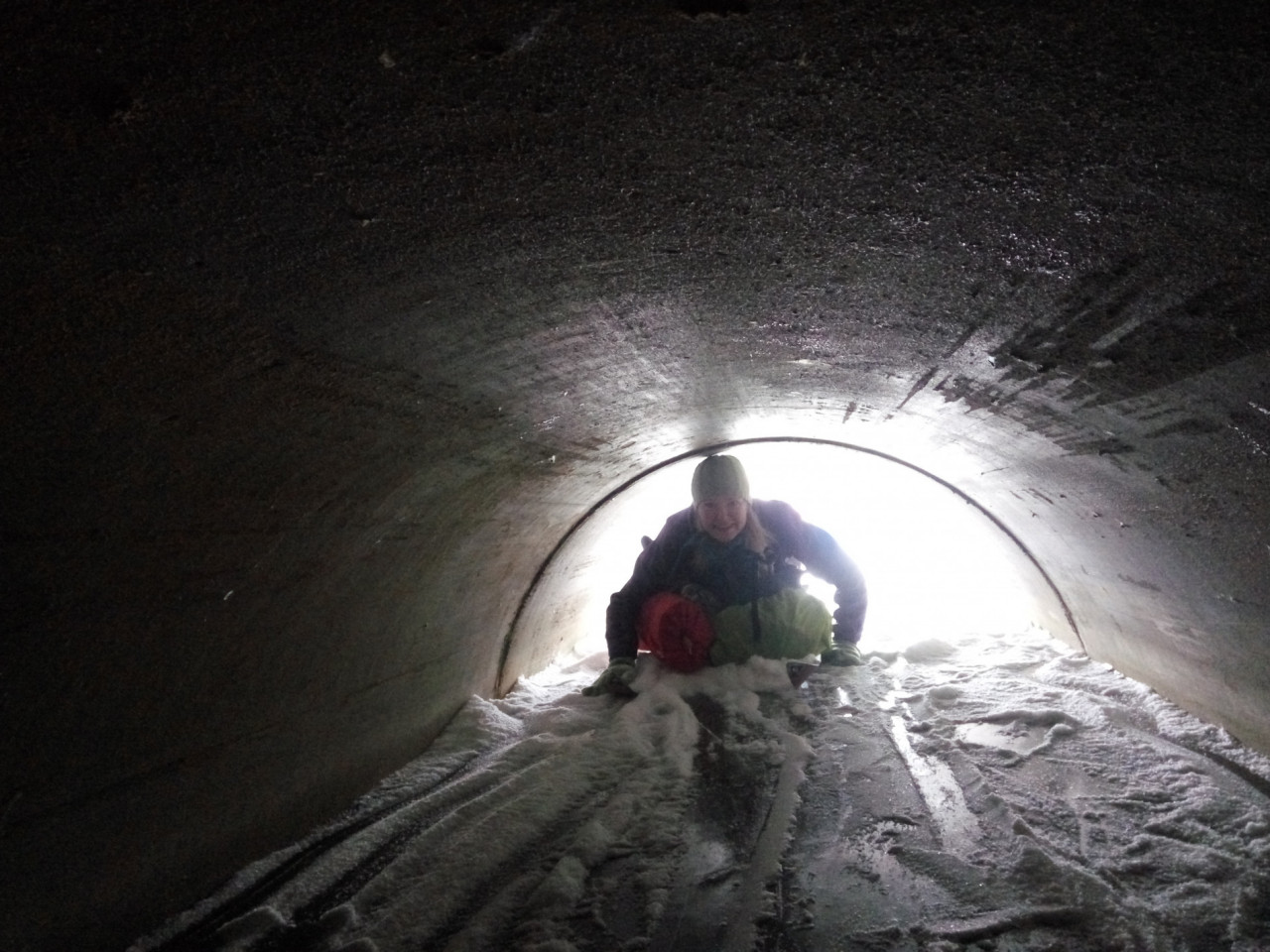 Сечение трубы было заполнена твердой водой в виде льда на 60%, и варианты передвижения внутри нее ограничивались только фантазией участников.