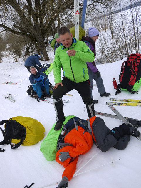 Мы шли, кайфовали, приваливались... Вася тропил, Сергей спрашивал у всех “Нравится ли вам болото Моховое?” и “Нравятся ли вам походы с Волосачом?”, Таня падала и вставала, Арман потихоньку ушатывался, Прохор мучался с креплением. Периодически Арман еще говорил, что в Казахстане тоже хватает подобных болот. Но ему объясняли, что он не прав, т.к. в Казахстане нет Волосача с фразой “Белорусские болота зимой особенно прекрасны! Они просто оху….енные” (с).