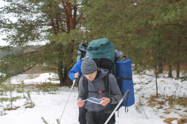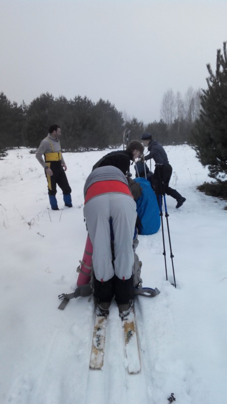 Около 10.00 в составе 12-ти человек высадились на станции Красный Бережок, сделав пересадку в Молодечно. По дороге то и дело слышались разговоры о том, что кто-то что-то да и забыл, в основном поспать. Очень скептично все рассматривали наши с Жанной лыжи, деревянные и ничем не обработанные. Максим Полянский многозначительно сказал: «ну что ж, будем крепиться».