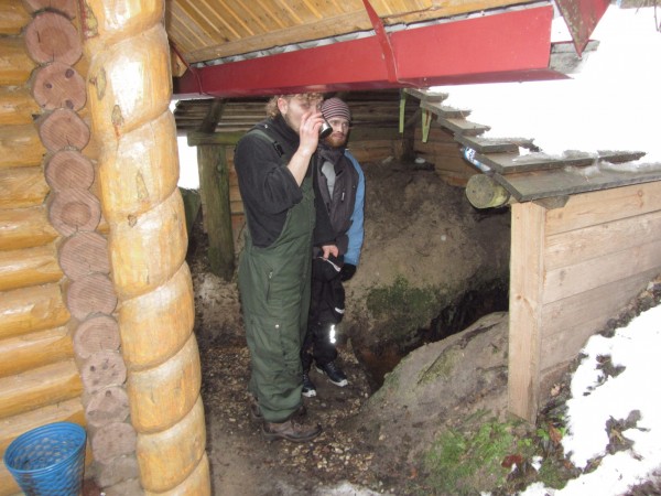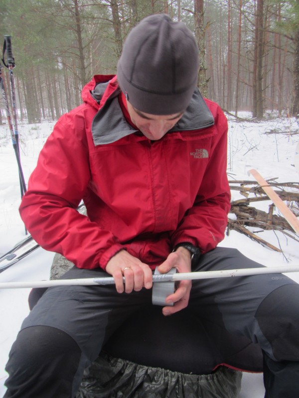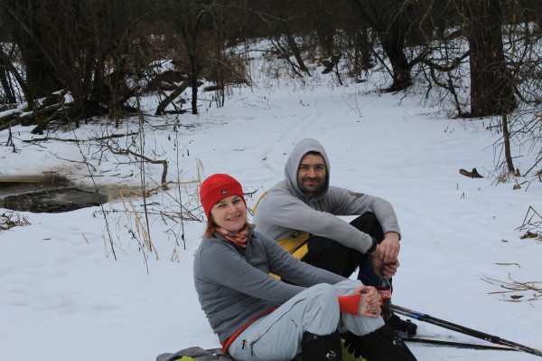 Зашуршали дальше. Максим Полянский, по старой доброй традиции сломал палку, которую по ходу движения пытался шинировать. 14.30: форсируем ручей с очень говорящим названием – Смердея. Далее - купель. Сбиваемся с маршрута. Мужчины напряженно всматриваются в распечатки трека. Выясняется, что нам еще идти две страницы. Косте надоедает валяться на скользких, укатанных дорожках, и он решает идти пешком. Где-то на следующем привале я тоже решаю спешиться: для сравнения, ну и некоторая психованность появилась.. руки нагружаются, а скорость ниже среднего.
