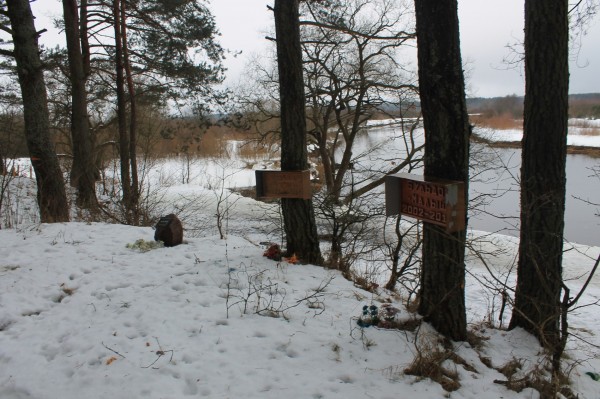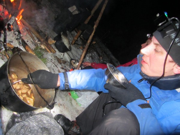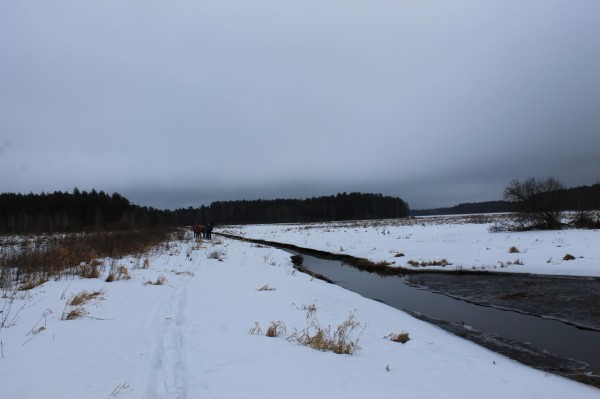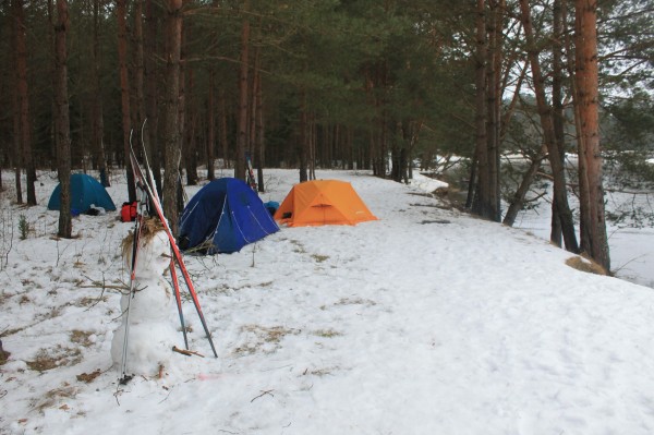 Темнело. Шли по обрывистому берегу Вилии. В темноте на лыжах идти довольно напряженно для глаз, ювелирно: нужно выхватывать не абстрактное место для шага, а конкретную форму лыжни. Около 20.00: дошли до места ночевки внезапно и радостно.