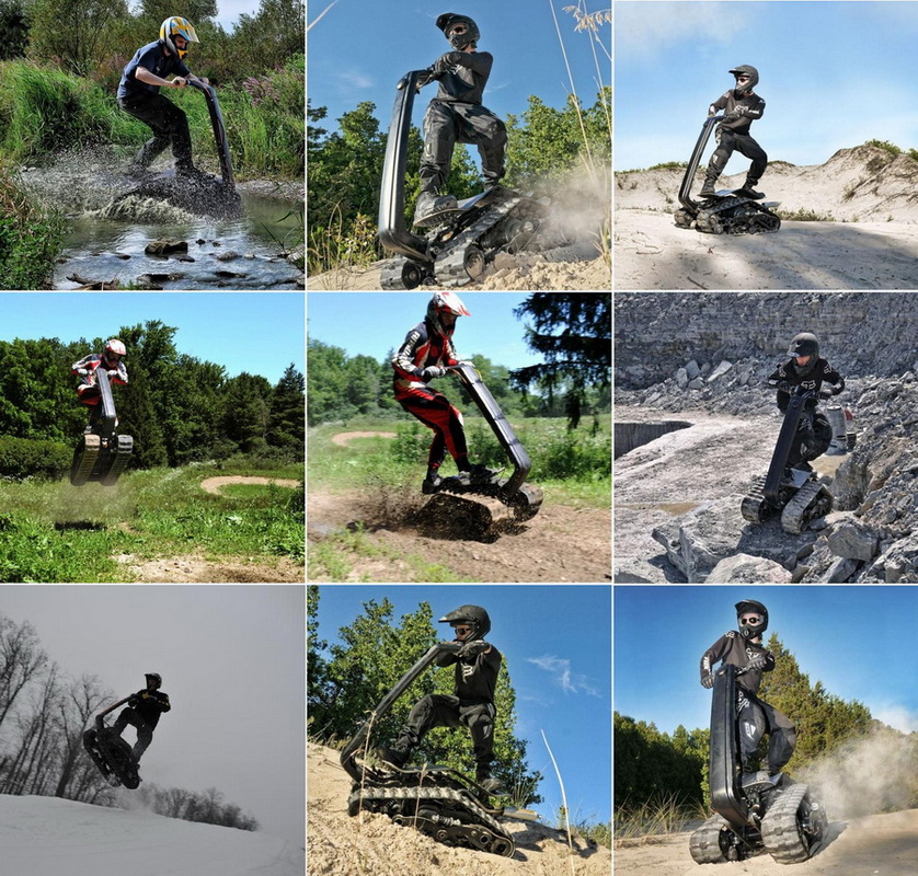 Недавно в продаже появилось необычное транспортное средство, одновременно похожее чем-то на самокат, скейт, Segway и… танк. Даже трудно сразу определиться с его названием – то ли это вездеходный самокат, то ли самокатный вездеход, то ли как-то ещё. Официально он был назван DTV Shredder, поскольку ходовая часть машины включает 2 гусеничных трака (Dual Tracked Vehicle). Его придумал и разработал ещё в 2010 году талантливый канадский изобретатель Бен Гулак.