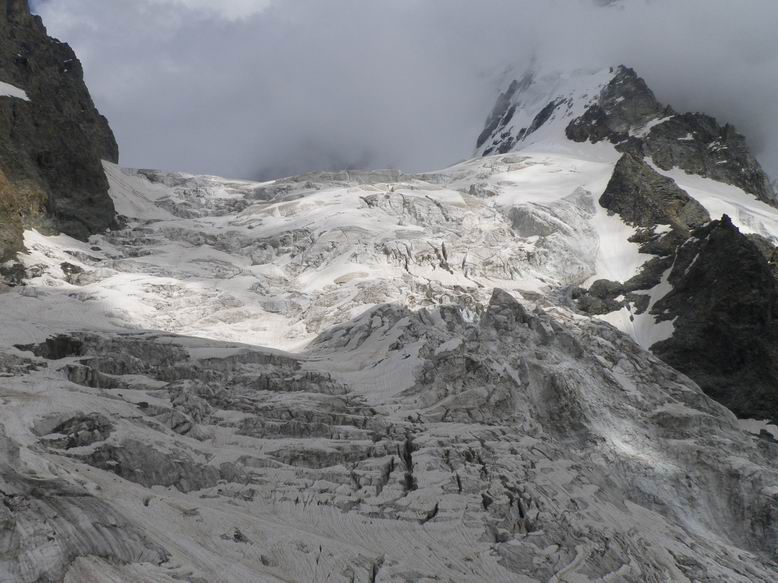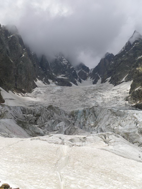 Сам ледник Чалаат разбит в верхней части, также – в средней части и в нижней части. Верх – связки и дюльфера, далее – по вкусу и ситуации. Мы ходили развязавшись, ледник был открыт.