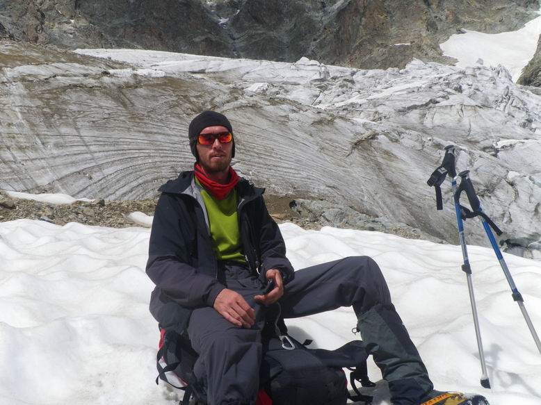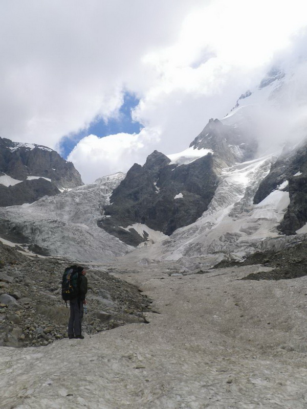 Затем следует перехож через первый ледопад. При достатке времени и лайтовой ходьбе – ночевки на правом (если по ходу – левом) борту над ледником. Живописно и достаточно безопасно. Вот фото тех мест. (на фото – Рома, мой напарник, участник похода)