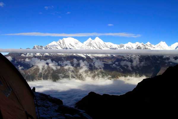16 октября 2013 "Пролезли 5 веревок в час обстрел снегом. Трудно и опасно лезть. Ночуем синя на 6000м"
